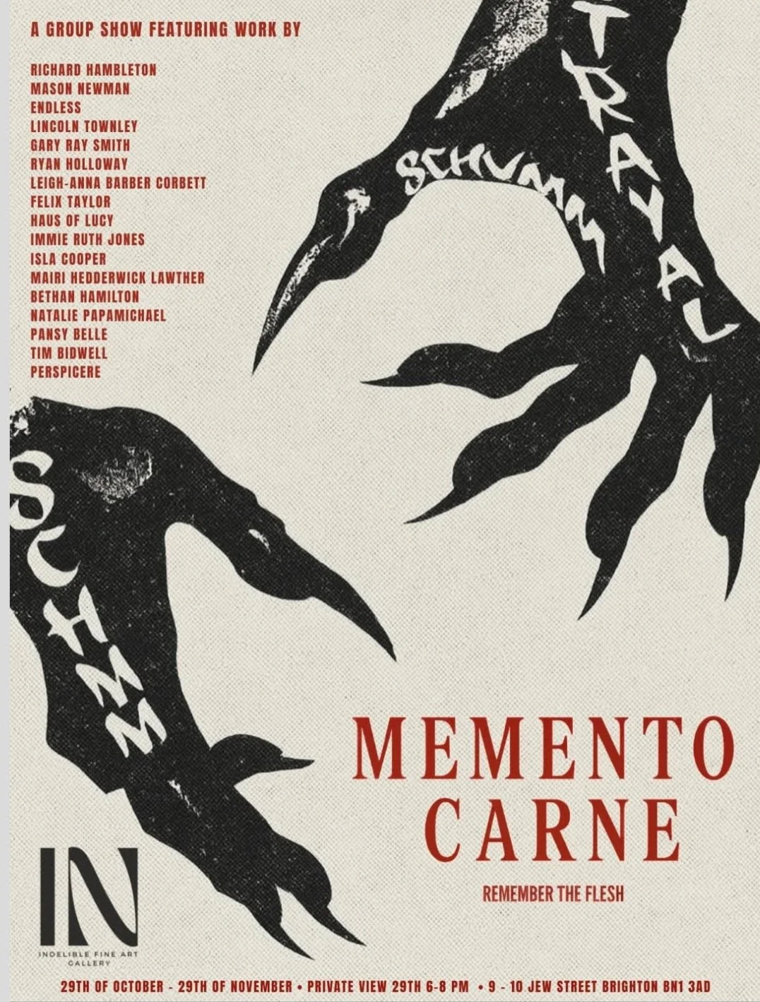 Opening on Halloween night, and running all through November 2025, I had two pieces exhibited in Indelible Fine Art’s exhibition ‘Memento Carne’, located in Brighton and Curated by Kitty Smith. This exhibition explored death and gothic themes in art, ‘were canvas becomes flesh and art becomes apparition’.